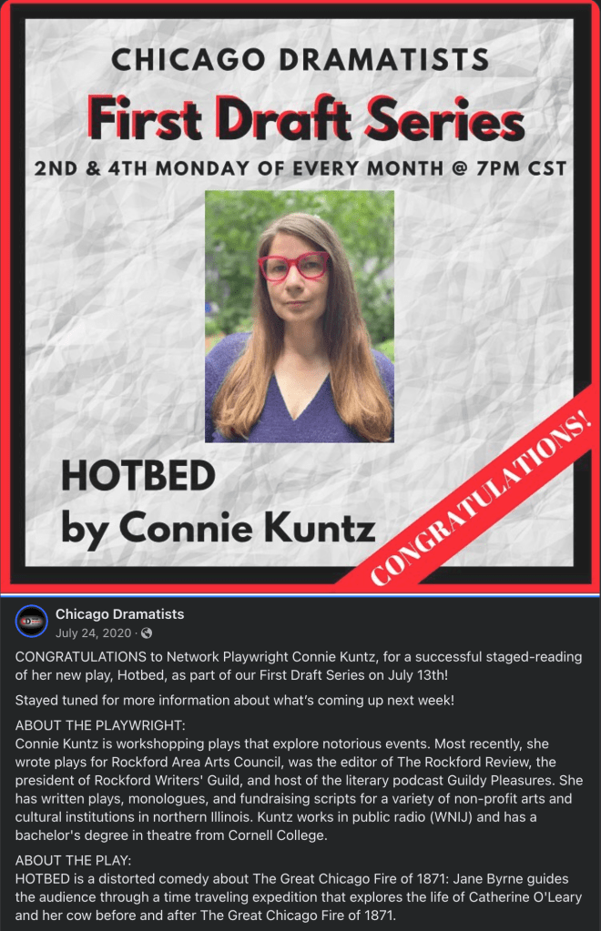 December 11, 2023 – Staged reading of my play Hotbed through Naked Angels Tuesdays@9 Chicago at Chicago Dramatists. This play has also received a reading through Chicago Dramatists First Draft Series and a recorded reading with WNIJ in 2018.