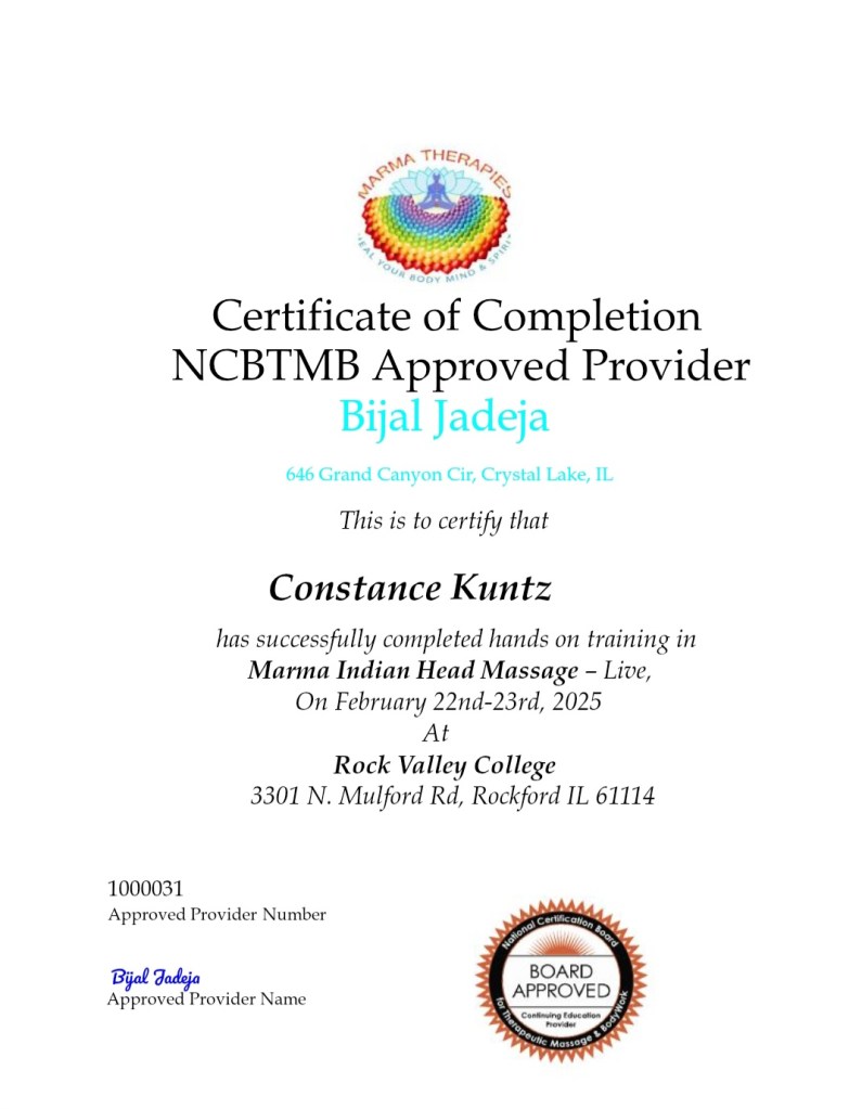 February 22-23, 2025 – Learned Marma Indian Head Massage at Rock Valley College.