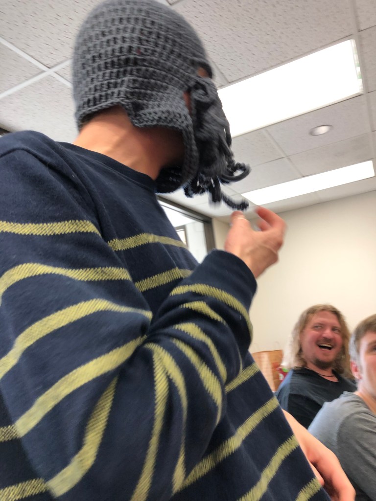 Cthulhu, as written by H.P. Lovecraft, is a fearsome character and not exactly good looking. He’s part octopus, part dragon, part human, part beast and ALL FEAR! He makes brave men go crazy! The young man who received the ski mask, though highly respected, also happens to be one of the most gentle souls on Earth. Seeing this kind-hearted person don the Cthulhu mask was purely hilarious.