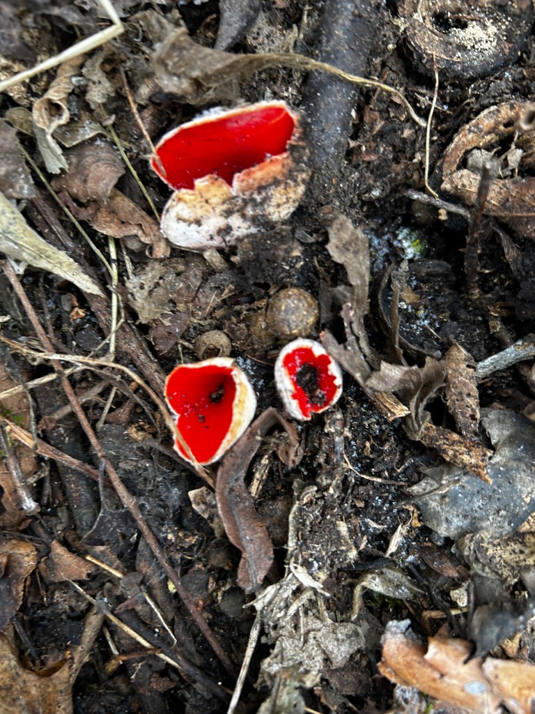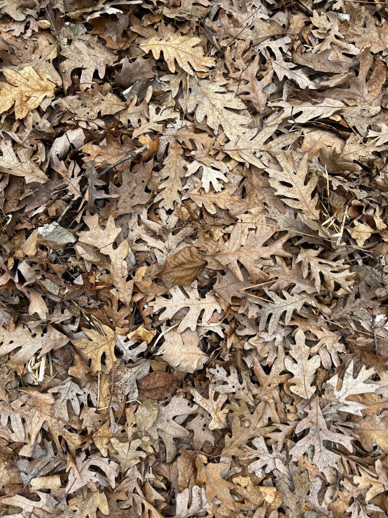 I also found these adorable scarlet elf cups. These tiny mushrooms are about the size of your smallest fingernail. Their bright shade of red is beautiful to behold but — stay with me — so are these dead oak leaves (below). Today I marveled at how perfectly scattered they are. A fine protective covering of all sorts of insects and wildlife. They are soft and springy to walk on and brown (all shades!) is my favorite color.
