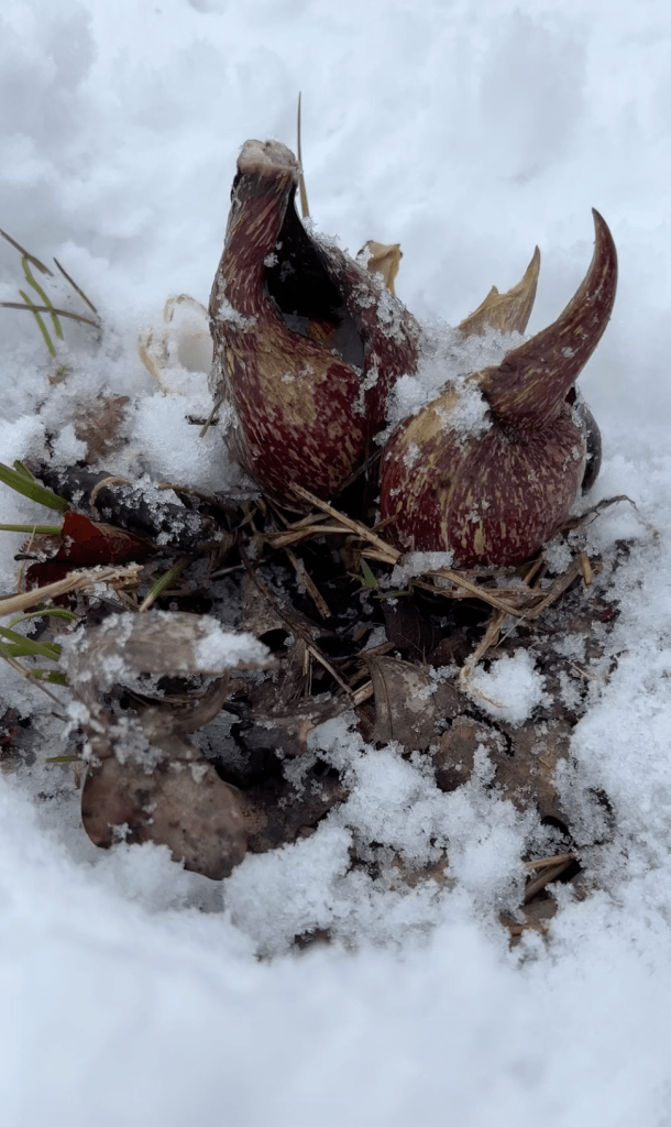 Skunk cabbage is a spring ephemeral that emerges in the late winter. This plant generates its own heat — up to 95 degrees Farenheit! It gets so hot that it bursts through the frozen ground and melts the surrounding snow.