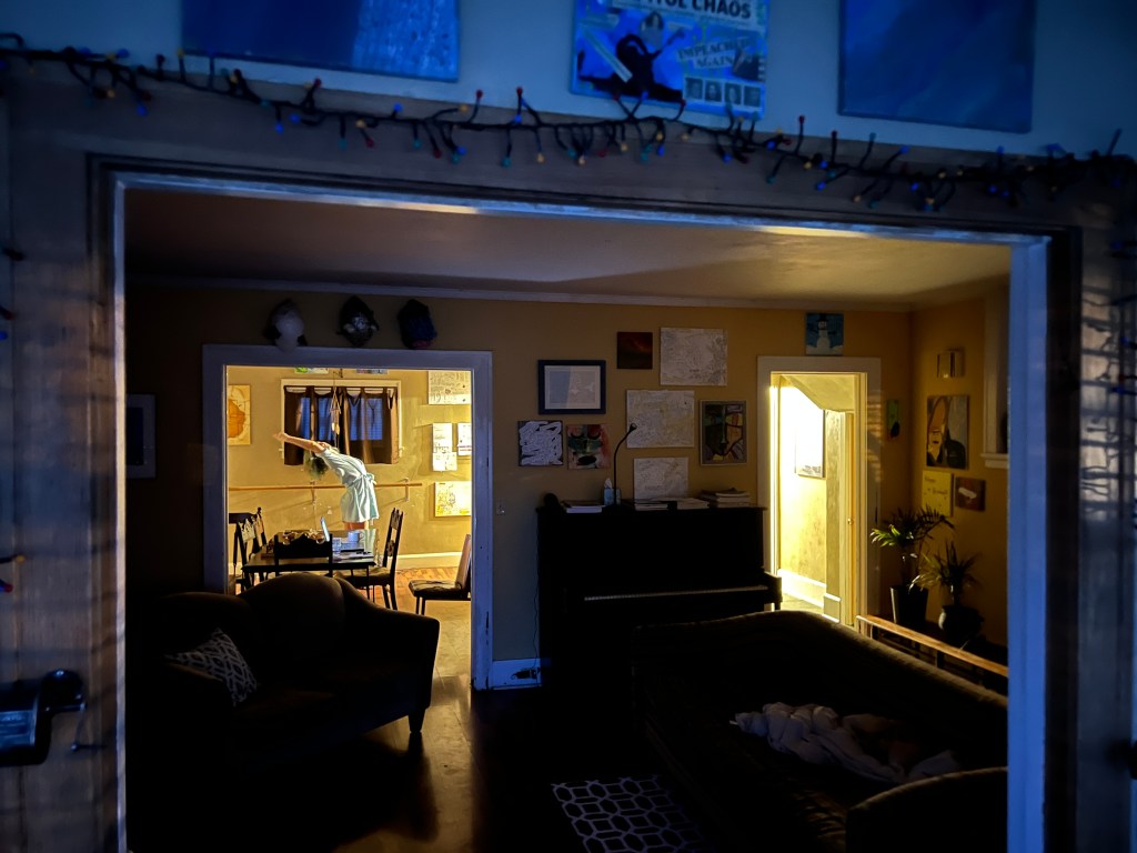 They did a terrific job but there are still some holiday scraps. For instance, there is a strand of Christmas lights still hanging over the entrance to the sun room. I just went in there to take a photograph of my “most challenging chore” for this blog and realized Jocelyn was doing her barre work in the background.