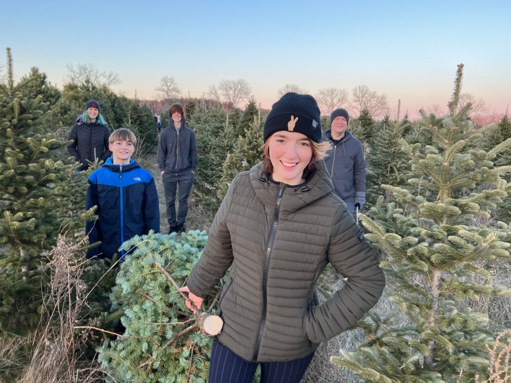 My family emerging from Williams Tree Farm. That’s Fern in the front, then Angelo (blond), Jocelyn (teal hair), Sam (hoodie) and Jesse (hat).
