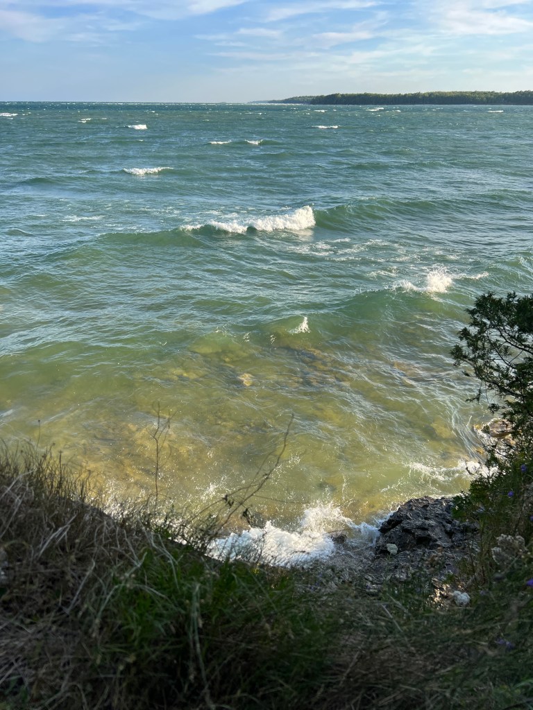 We’re on a cliff that overlooks Lake Michigan. Stunning views. I recently read a book (Siri, Who Am I? by Sam Tschida)where one of the characters said he liked views that overlook large bodies of water because “you can see your enemies coming.”