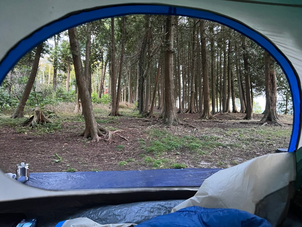We got here a few hours ago, set up our site, ate some chips and hopped in the tent. It’s not even 8:30 p.m. and we’re tucked in for the night. No campfire this evening because it’s too windy.
