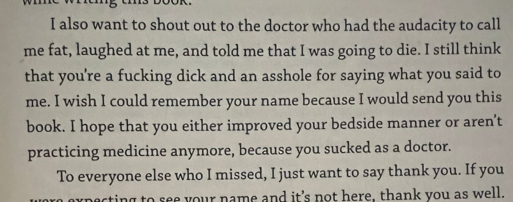 Evans wrote, “I also want to shout out to the doctor who had the audacity to call me fat, laughed at me, and told me that I was going to die. I still think that you’re a fucking dick and asshole for saying what you said to me…”